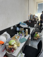 个别实验室也存在一些安全隐患问题:(1)冰箱旁堆放泡沫箱;废液瓶及实验用料瓶罐未放置相应位置(C413-2室);(2)充电器未拔(C412室);(3)部分实验室和休息室存在卫生脏乱、值日安排不到位的情况,包括:①室内较杂乱,需规整。(C419室、C413-1室);②地面较脏;室内环境较杂乱;休息室存放较多烹饪调料;未安排卫生值日表(C412室);③值日表时间未更新(C413室)。