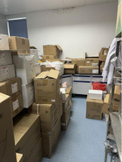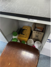 C413-2室冰箱旁堆放泡沫箱;废液瓶及实验用料瓶罐未放置相应位置