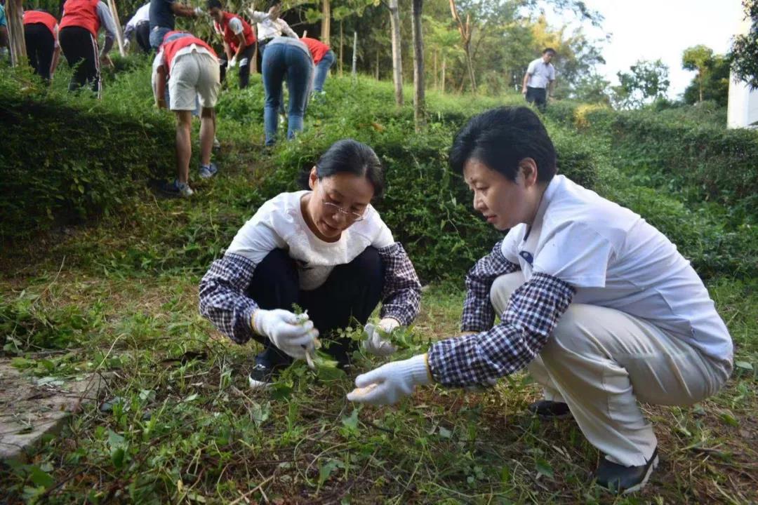 启动仪式后,张建华书记带领老师同学们一同来到时珍山进行除草劳动,在中药资源学部老师们的指导下,师生们边劳动边认药,实现了劳动教育与专业教育相结合。大家分工协作、配合默契、互帮互助,不到一个小时,杂草清理任务就完成了,时珍山面貌焕然一新。
