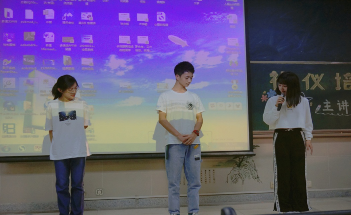 培训刚开始,段聪老师就通过日常交往的情景重现,指出了同学们存在的礼仪问题,并借此讲说礼仪的特征和重要性;段老师还示范了在不同场合所需要的礼仪姿态,以此增强同学的印象,强化同学的礼仪观念。