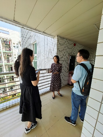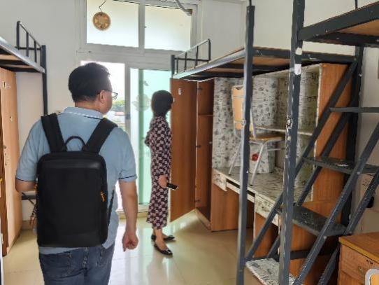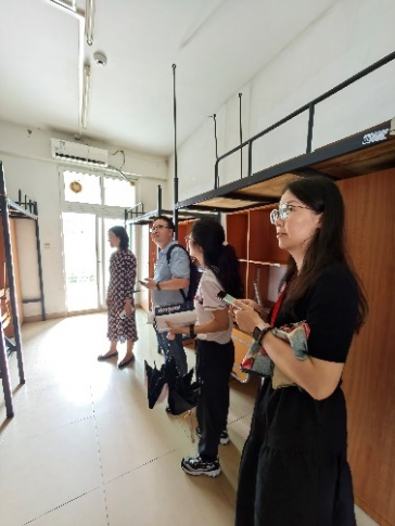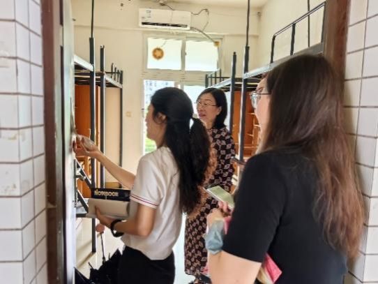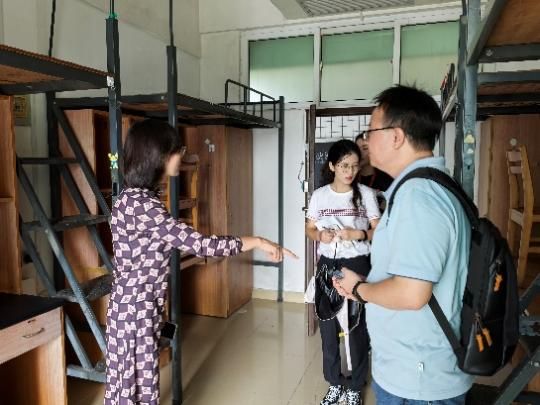 张娟书记与辅导员逐一走访宿舍,认真细致地检查宿舍内家具、电器、环境卫生情况,检查组人员详细记录了各项检查情况,并对存在杂乱贴纸的桌面和宿舍卫生提出整改措施,为迎新生“到家”做好充分准备。