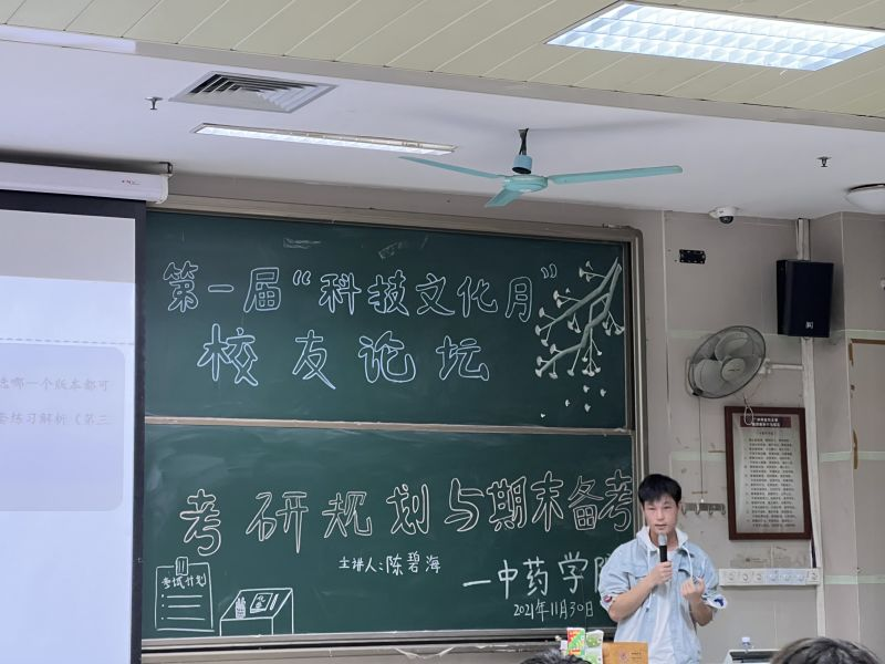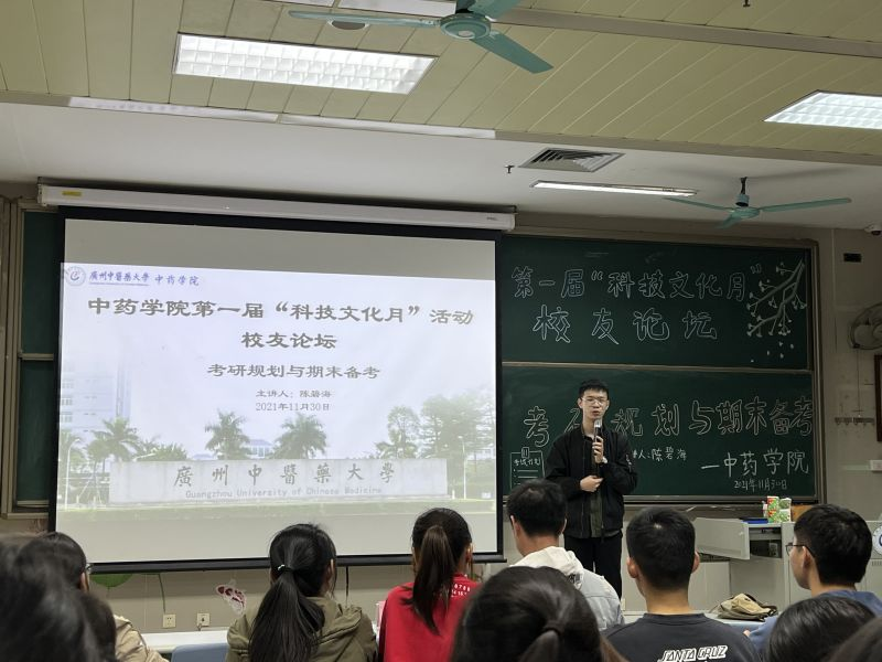 2021年11月30日晚19点,21级中药学1、2、3班在综合楼302举办谈球吧第一届“科技文化活动月”之员工论坛活动,特别邀请陈碧海员工来为大一新生做期末备考经验分享。班级辅导员张子希老师出席并主持。