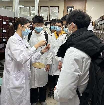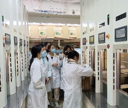 同学们参观了门诊中药房及门诊南楼药房,观看中药饮片、中药膏方、中药颗粒剂调配,并现场学习中药药品阴凉保存方法、了解毒性药物管理方法、中药师工作内容等,同时全程参观了智慧中药房,观看系统自动配方。