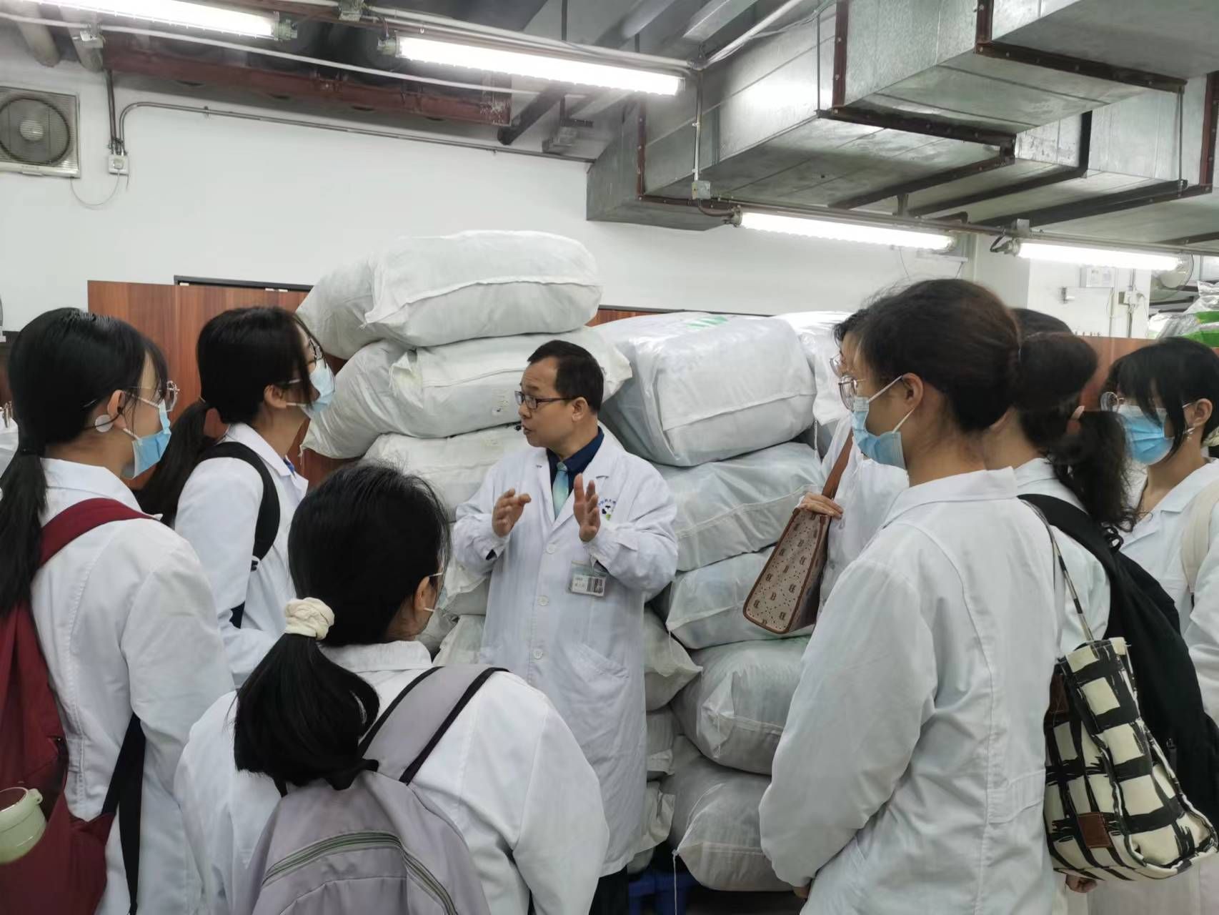 中药仓梁文能老师向同学们详细介绍了仓库中药品种数量、中药保存方法、中药鉴定方法等。
