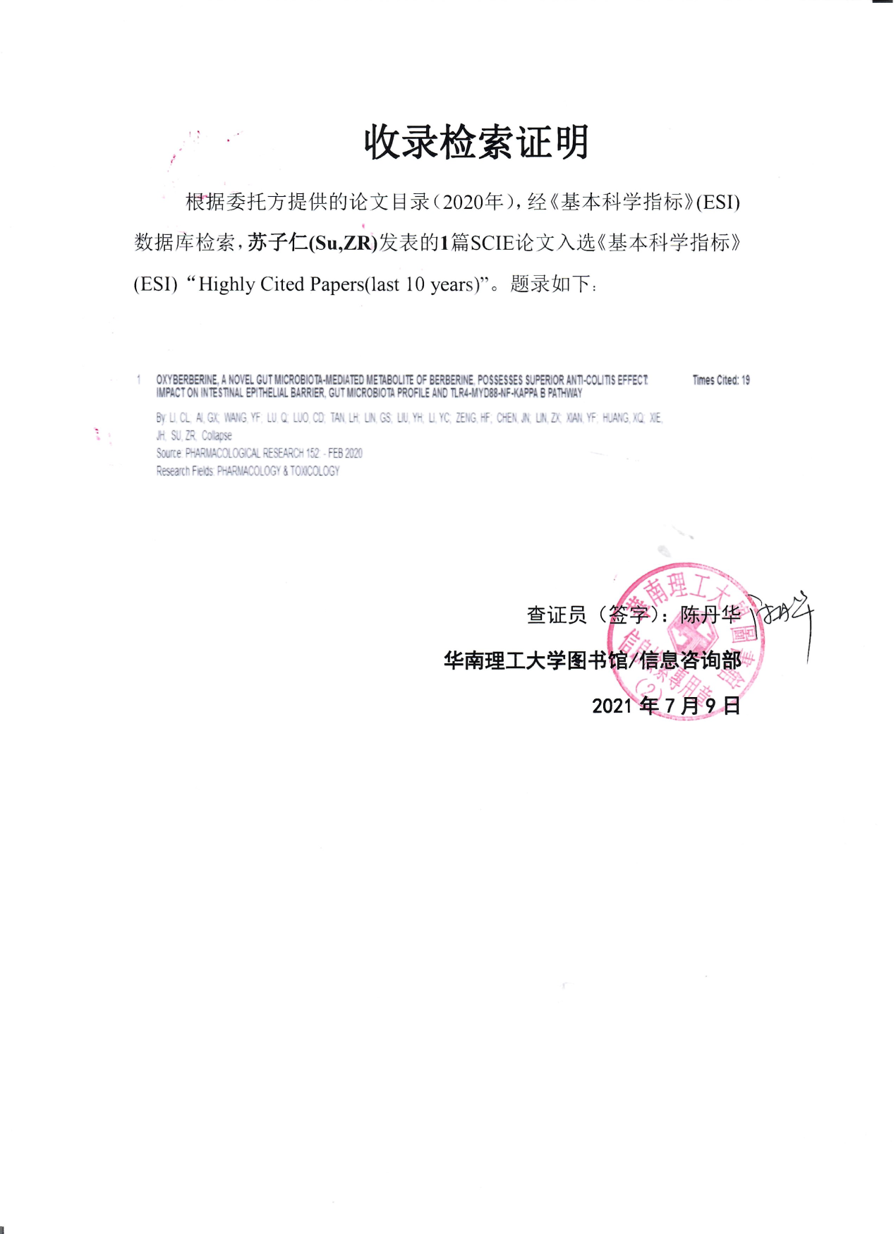 近日,以谈球吧苏子仁研究员、第二临床医公司谢建辉副研究员为通讯作者,2019届博士生李彩兰为第一作者,在国际药理学联合会(IUPHAR)下属的药理学专业期刊Pharmacological Research(JCR Q1,IF 7.658)发表的关于小檗碱代谢与药效的研究论文《Oxyberberine, a novel gut microbiota-mediated metabolite of berberine, possesses superior anti-colitis effect: Impact on intestinal epithelial barrier, gut microbiota profile and TLR4-MyD88-NF-κB pathway》,被美国《基本科学指标》(ESI: Essential Science Indicators)收录为药学及毒理学(Pharmacology & Toxicology)学科的高被引论文(Highly Cited Paper)。