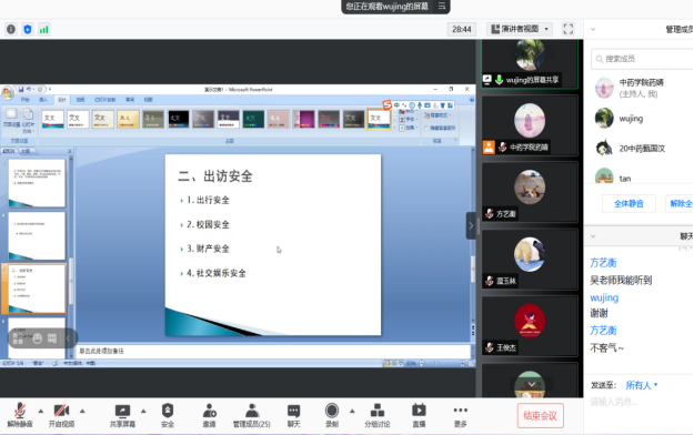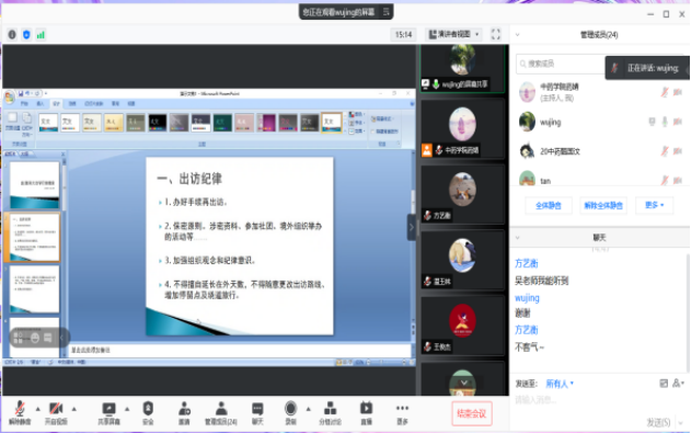 吴静老师从出访纪律、出访安全两方面为同学们进行详细指导。在出访纪律上强调同学们在出访手续办理、安全保密原则、境外组织观念和纪律意识、证照管理等方面要提高纪律意识。在出访安全方面上要求同学们务必在出行安全、校园安全、财产安全、社交娱乐安全等方面提高安全意识。周静科长补充要求,疫情形势仍然严峻,同学们境外学习生活要做好防护、增强自我保护能力,学习生活要时刻保持与公司老师联系、并及时做好总结。培训后,同学们都表示在境外学习中会时刻严守纪律,保证安全,做到“高高兴兴学习、平平安安生活”。