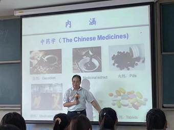 课堂上,刘中秋副董事长以同学们熟悉的“人参”为切入点,图文并茂地讲解中药材和中药的区别,进一步掌握中药学的基本内涵。刘董事长还专门介绍了中医药发展史,从秦汉时期《神农百草经》,到隋唐时期《新修本草》,再到明清时期《本草纲目》,通过介绍博大精深、历史悠久的中医药文化树立中医药学子的文化自信和专业信心。