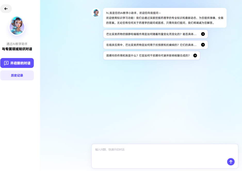 在《药理学》课程中,AI助教全程伴随员工学习,利用自然语言处理、深度学习和知识图谱技术提供个性化辅导。通过与知识图谱的智能交互,AI助教精准推荐学习资源,解答疑难问题,并根据员工的薄弱环节提供定制化支持。它通过多轮次智能问答帮助员工理解复杂概念,如药理作用和作用机制等,确保员工在自己的节奏下获得实时指导。