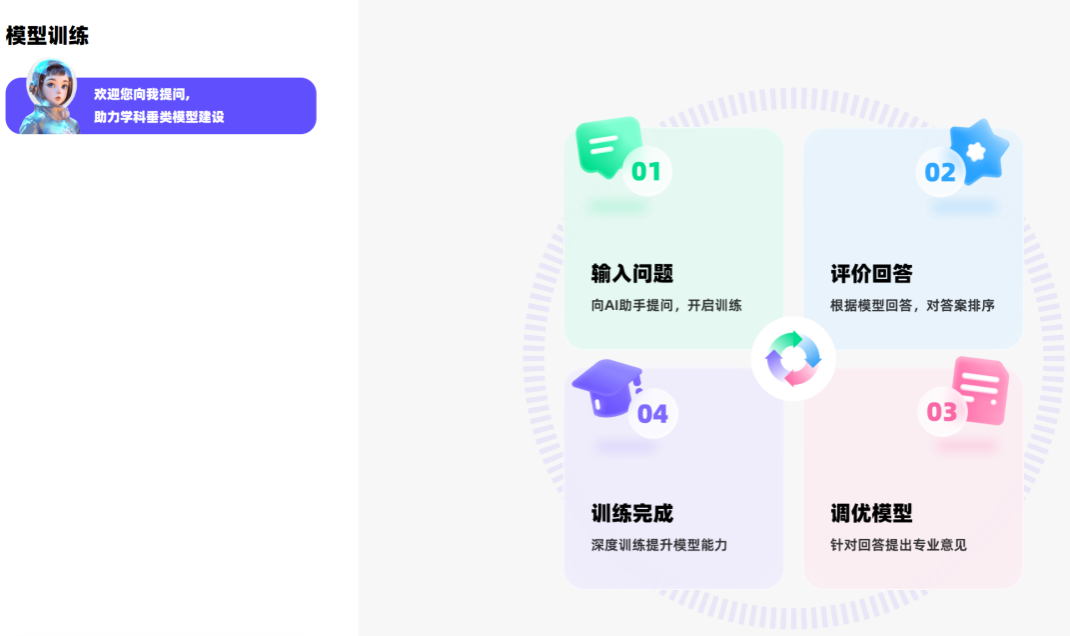 在《药理学》课程的模型训练中,教师通过与AI互动,不断优化模型的回答精度。教师向AI提出与课程相关的问题,AI根据问题生成多个答案,涵盖不同层次的知识。教师根据这些答案的准确性和深度提供反馈,持续优化AI模型,逐步提高其智能化和精准度,最终为教师和员工提供个性化的教学支持。
