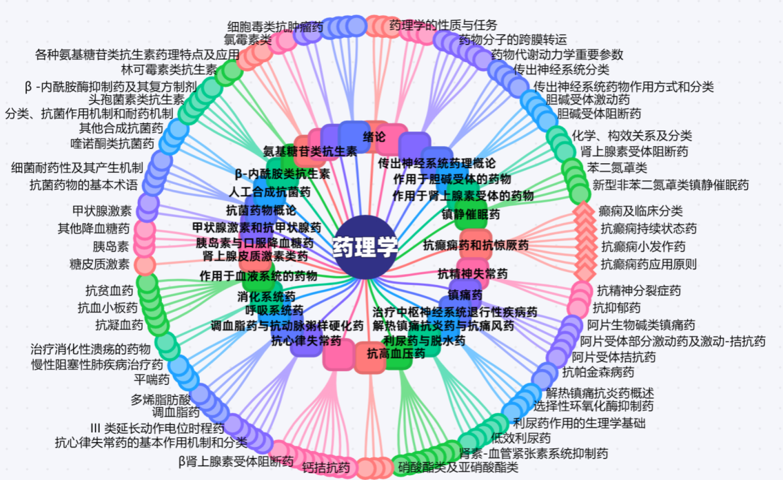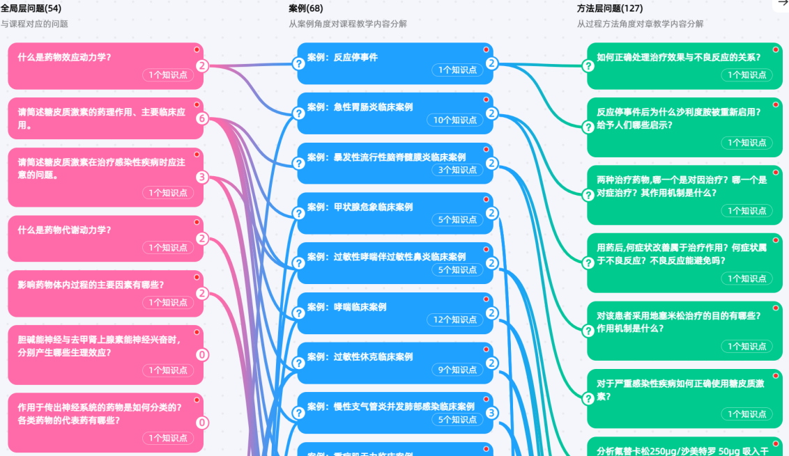 在《药理学》课程的知识图谱构建中,课程团队采用了“临床用药案例驱动”的教学特色,通过将核心知识与实际临床用药案例结合,推动员工的主动学习和应用能力。员工在解决临床病例时,不仅学习基础药理学知识,还通过各种案例,深入理解药物的作用机制及不良反应。
