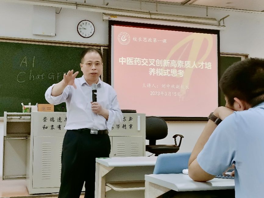3月15日上午,刘中秋副董事长以“中医药交叉创新高素质人才培养模式思考”为题,在大学城校区教学楼A212课室为2021级中药学4班同学上新学期“思政第一课”。