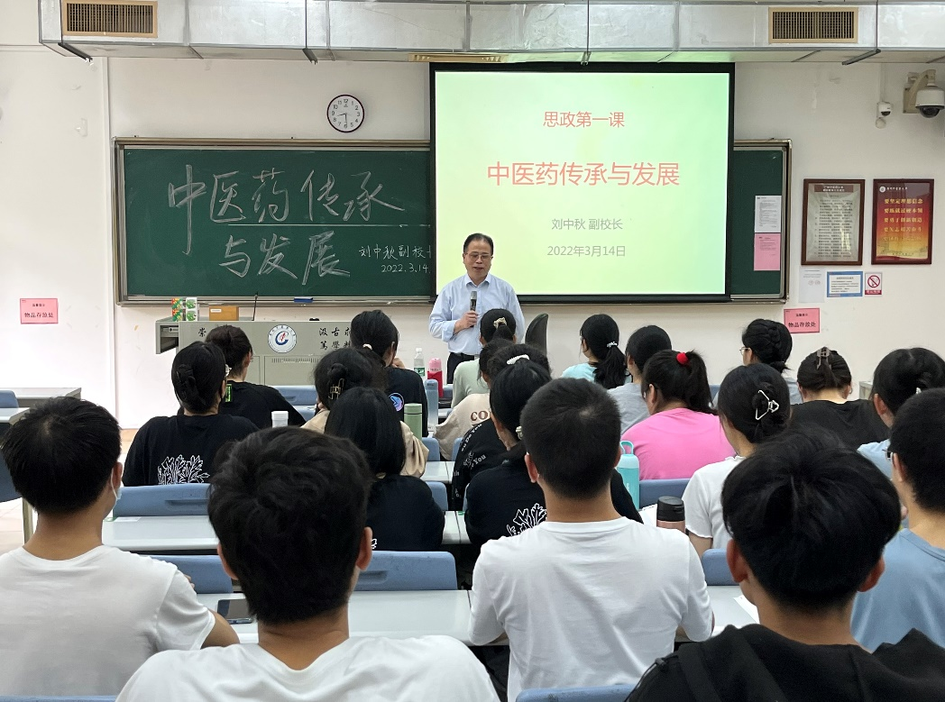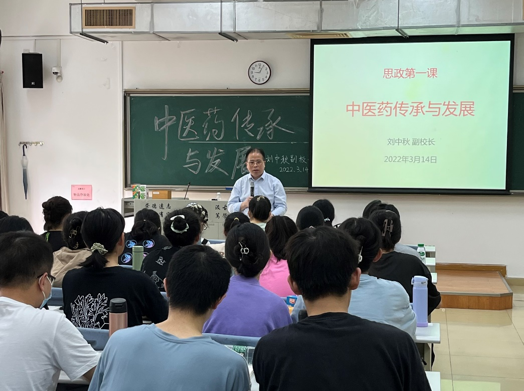 2022314日上午,刘中秋副董事长以“中医药传承与发展”为题,为所联系的2021级中药5班的同学们讲授一堂精彩的“思政第一课”。刘中秋副董事长和同学们探讨中医药文化的深刻内涵,勉励同学们要刻苦学习、求真务实、守正创新,努力成为中医药文化的传承者与发扬者,撑起中医药未来的“一片天”。