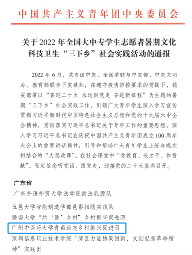 实践队队员主要为谈球吧团委、校红十字会员工分会、青春健康同伴服务队员工骨干。于2022年7月,前往云浮市开展暑期“三下乡”社会实践。实践队聚焦乡村振兴主题,开展了中医药健康服务、中医药文化进校园、南药种植调研等中医药特色鲜明的活动,同时走访老党员、参观当地红色旧址,强化思想引领,展现了新时代中医药青年使命担当。团队还曾入选了“走近千村观察,助力乡村振兴”全国老员工暑期社会实践专项活动。实践队开展活动以来,引发社会的积极关注,事迹受到中国青年网、南方+、新兴广电等媒体的关注。