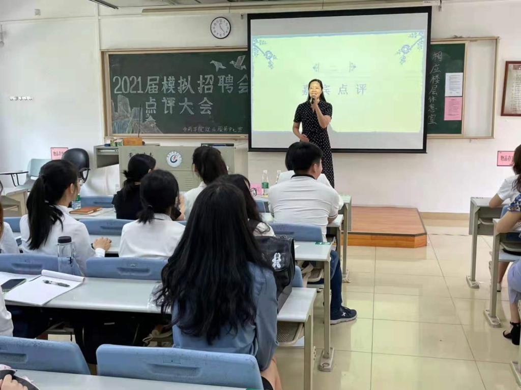 模拟招聘会分为校企交流会、企业宣讲、模拟面试、点评大会四部分。在校企交流会中,陈其煌副书记向各企业HR表达了诚挚的欢迎并表示希望与用人单位加强联系,各企业代表也分享了自己对于本次模拟招聘会的期待。宣讲会期间,企业HR向员工介绍了企业文化、招聘岗位、岗位要求并通过提问、抢答等方式让员工更深入了解意向药企。在面试过程中,同学们着正装,运用学习到的理论知识,结合以往面试经验,将自己最好的一面展现给面试官。